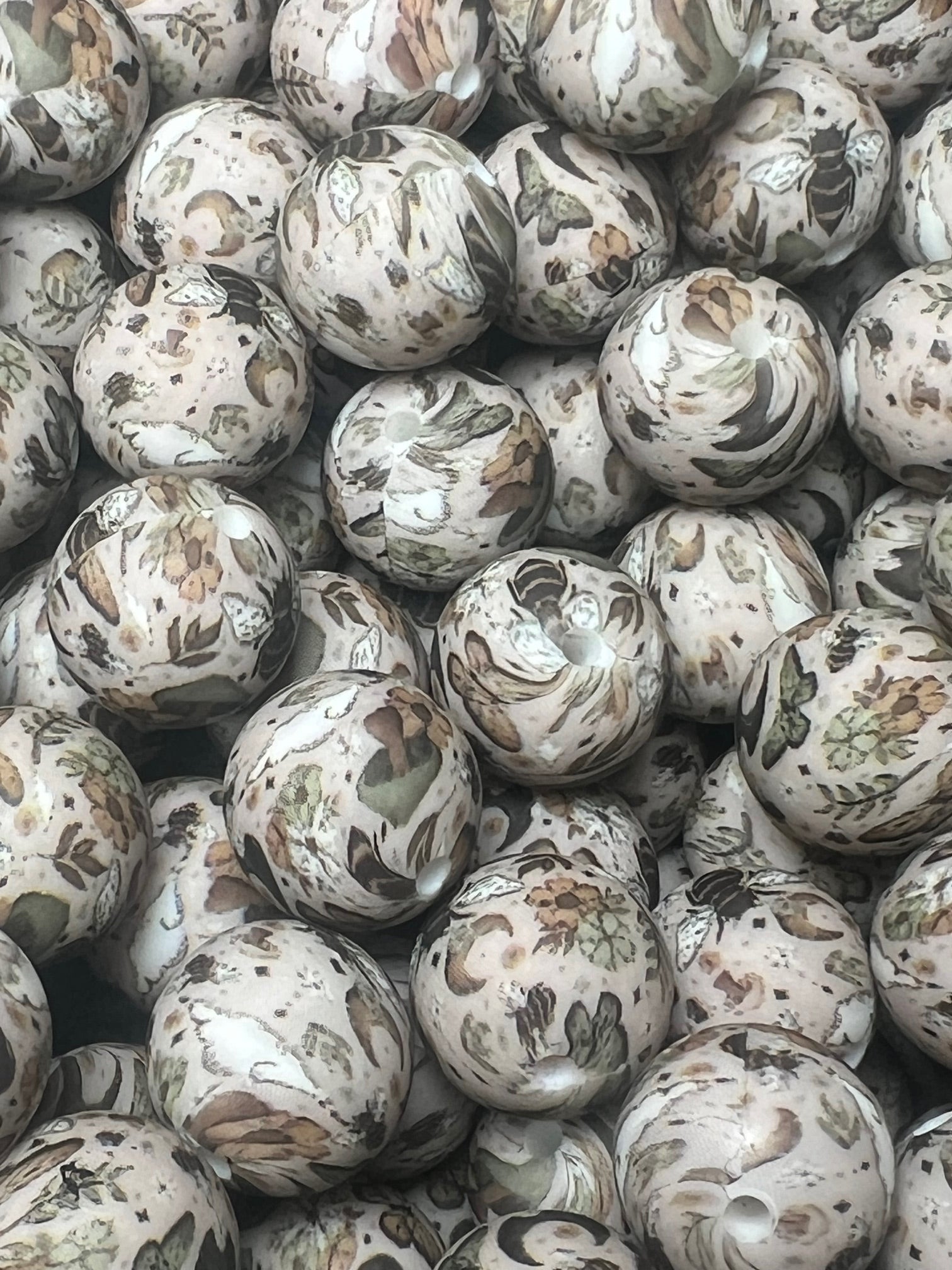 15mm Print Wonderland Field Round Silicone Beads, Coffee Silicone Bead