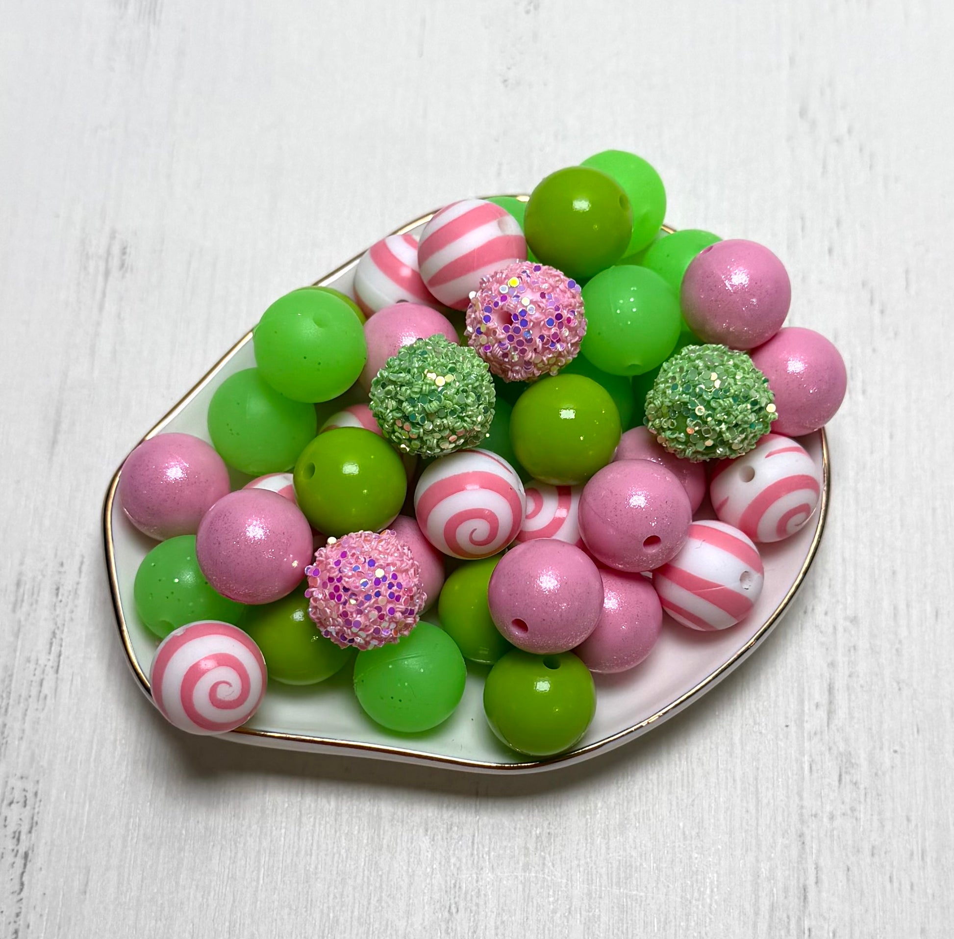 15mm : 10 Opal Sweet Pink, 10 Liquid Lime, 10 Neon Green Glitter, 10 Pink Swirl