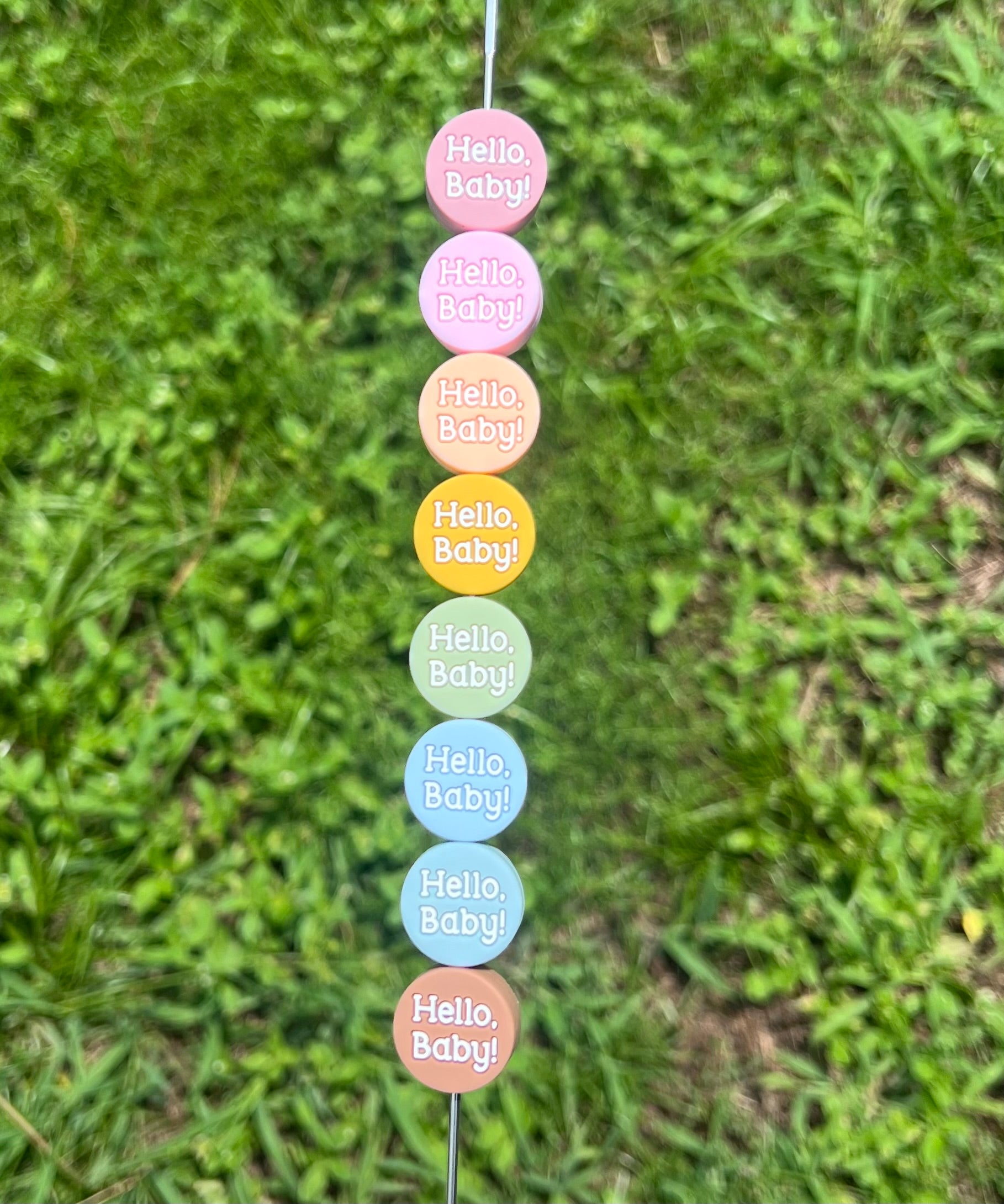 Hello Baby circle shape silicone bead with a hole size of 2mm. **Beads are made with 100% food grade silicone. BPA free, PVC free, Phthalates free, Lead free, Cadmium free and Nitrosamine free** ***Contains small parts, not intended for children. Beads can pose choking hazards. Never leave a child unattended with loose beads*** Join our Facebook group https://www.facebook.com/groups/454873932441251/