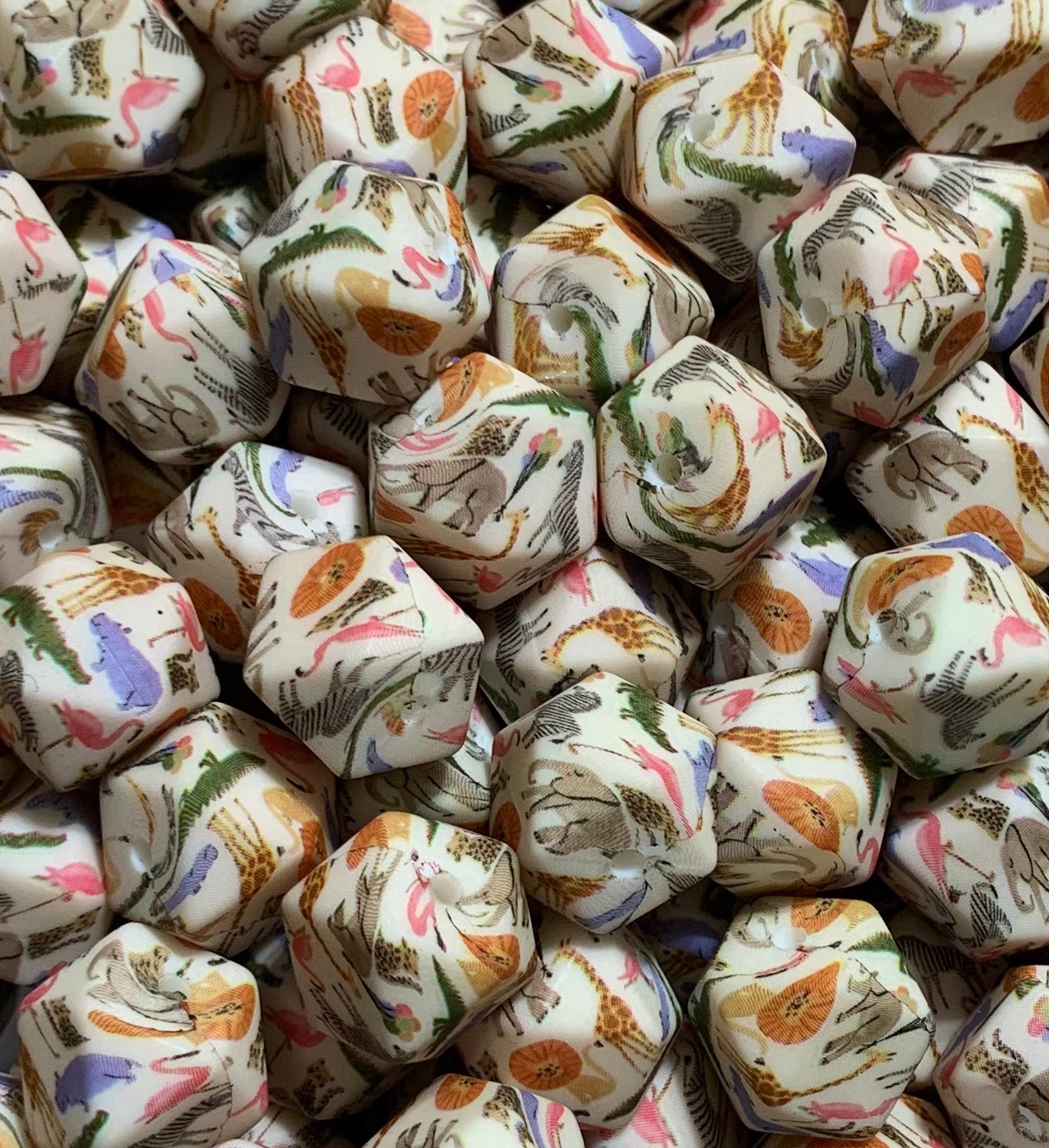 14mm Hexagon Print Zoofari Printed Silicone Beads